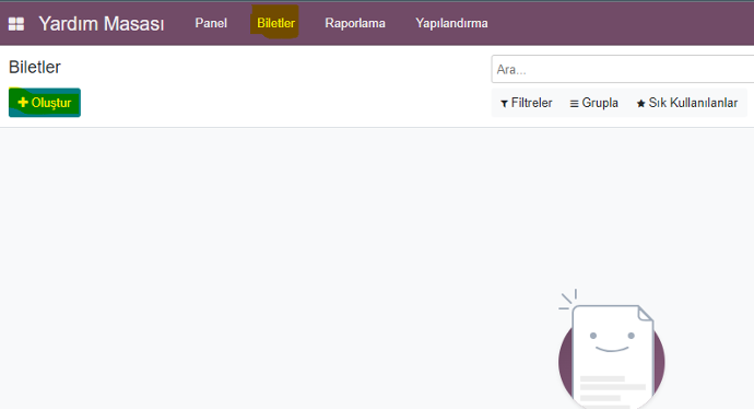 Biletler menüsünü açtığınızda "+Oluştur" bağlantısını tıklayarak yeni BT yardım talebinizi oluşturmaya başlayabilirsiniz.