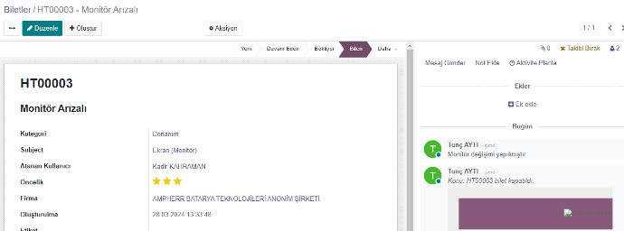 Dilerseniz Odoo'nun diğer modüllerinde olduğu gibi chatter alanında @ işaretini kullanarak log kaydı oluşturabilir. Dilediğiniz kişiye soru sorup, yanıt alabilirsiniz.